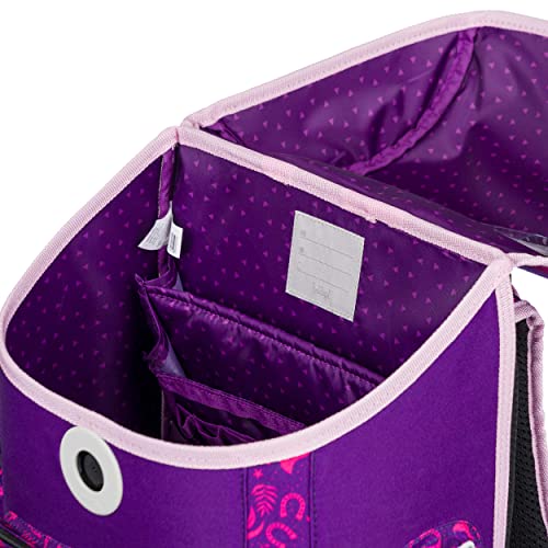 Kindvriendelijk design: ergonomische schooltas met groot hoofdvak, geïsoleerd ruim voorvak, Fidlock-sluiting en interne organizer voor gelijkmatige gewichtsverdeling. Zijvakken bieden voldoende ruimte voor drinkfles en kleinigheden
