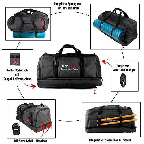 Specification: RYP-DO Sporttas 3-in-1 – reistas zwart – rugzakfunctie – 70+ liter met 7 vakken, scheidingswanden en apart bodemvak – sporttas XL