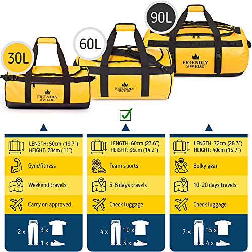 Specification: The Friendly Swede Sandhamn waterdichte reistas, plunjezak, rugzak, sporttas, duffel dry bag met rugzakfunctie, 30L / 60L / 90L, geel