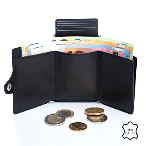 ZNAP Creditcardhouder met klem van aluminium en muntvak – RFID-bescherming – 8 of 12 kaarten versie – Slim Wallet – geld clip van SLIMPURO Znap, Zwart echt leer